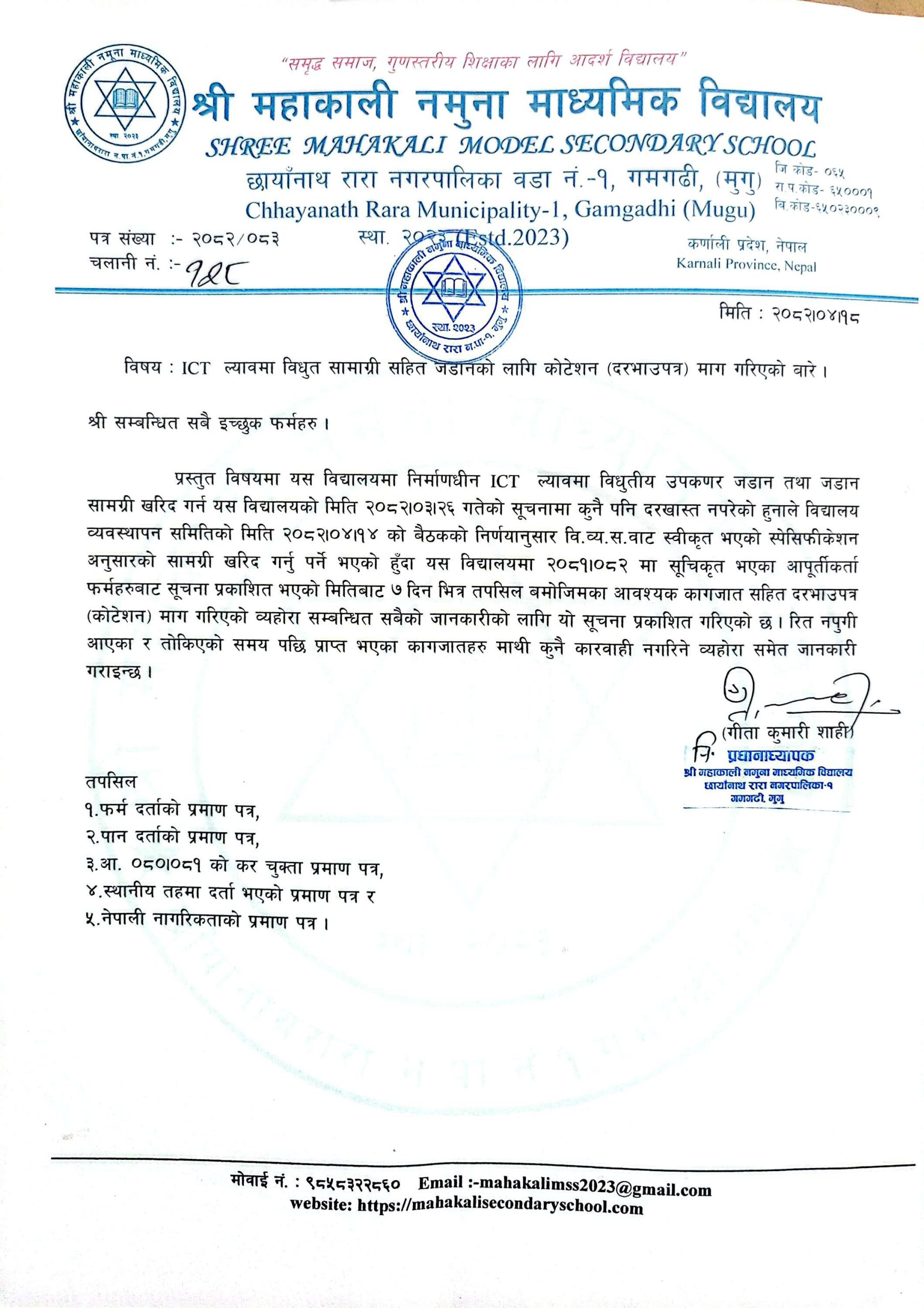 ICT ल्यापमा विधुत सामग्रीका सहित जडानको लागि कोटेशन दरभाउपत्र माग सम्बन्धमा